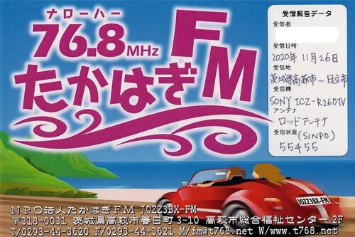 何故か記事が消えてたので再び投稿。 茨城県高萩市のコミュニティFM「たかはぎFM」のベリカードです。返信日数2日。 迅速な対応ありがとうございます。