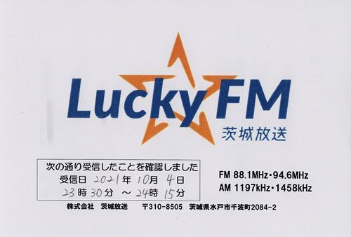 茨城放送(luckyfm)のベリカードです。 返信日数5日。今回は放送終了のアナウンスをレポートしました。 ↓旧デザイン